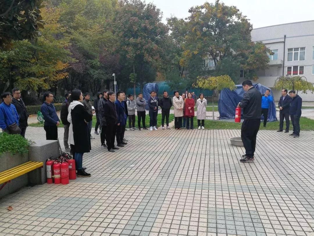 報告會結束后,公安處消防技防科負責同志指導學院師生在航空樓北廣場舉行了消防演練。