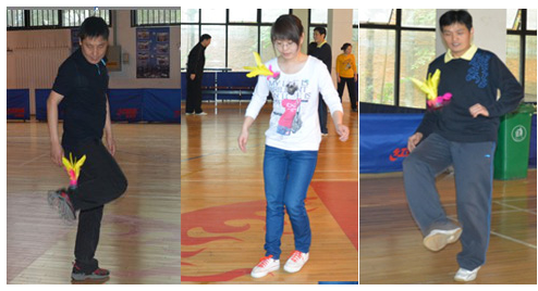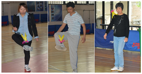 接下來的項(xiàng)目是兩個(gè)激烈又非常好玩的團(tuán)體賽,踢毽子和接力賽。在負(fù)責(zé)人的安排下,所有人員被分成四隊(duì)并推選出各自組長和團(tuán)隊(duì)口號,踢毽子比賽先開始,規(guī)則是團(tuán)隊(duì)中的每個(gè)隊(duì)員一次踢夠十個(gè),不能多也不能少,計(jì)時(shí)人員按照從第一個(gè)人開始計(jì)時(shí),以最后一個(gè)人踢完為結(jié)束,耗時(shí)最短的團(tuán)隊(duì)獲勝。小小的毽子在人們的腳和手之間飛舞著,對于踢得好的人來說,一次只能十個(gè)還真不過癮,而不會(huì)踢的人此時(shí)也豁出去了,各種動(dòng)作,雙腳配合,腳內(nèi)側(cè)的毽子剛踢出去,眼看就要落下來的時(shí)候用腳外側(cè)接住接續(xù),就這樣來回反復(fù)著,一會(huì)轉(zhuǎn)身,一會(huì)換腳,足以說明踢毽子是一項(xiàng)能夠鍛煉腳踝靈活度的運(yùn)動(dòng)!